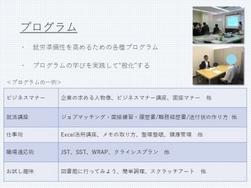 就労準備性を高めるための各種プログラム(ビジネスマナーの習得、コミュニケーションの向上、教養講習、就活力向上など)をおこないます。